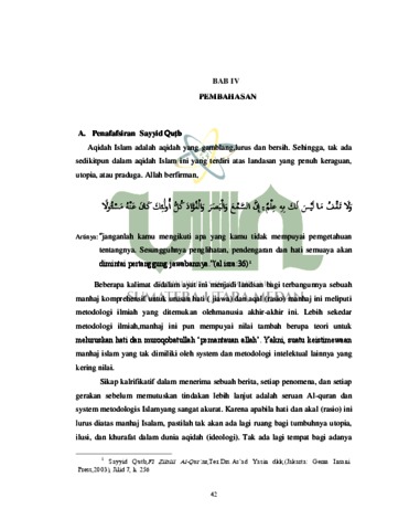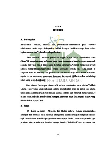 Skripsi ini membahas tentang larangan berbicara tanpa ilmu yang terkandung dalam surat Al-isra‟: 36 melalui analisis sayyid Qut{b dalam bukunya Tafsir Fi Z{ila>li Al-qur’an, Permasalahan yang harus dijawab adalah bagaimana larangan yang terkandung dalam surat Al-isra‟:36 dan apa pengertian larangan berbicara tanpa ilmu secara bahasa dan umum dan bagaimana pandangan Sayyid Qut{b dalam menafsirkan ayat 36 surat Al-isra‟ dan bagaimana pendapat ulama tafsir lain dalam menafsirkan ayat Al-isra‟:36. Dalam penelitian ini penulis menggunakan metode tahlili, suatu metode tafsir yang bermaksud menjelaskan kandungan ayat-ayat al-Qur‟an dan seluruh aspeknya. Artinya Mufassir mengikuti susunan ayat sesuai mushaf, mengemukakan arti kosakata, penjelasan arti global ayat, mengemukakan munasabah dan membahas sabab an-Nuzul, disertai Sunnah Rasul, pendapat sahabat, tabi‟i dan pendapat penafsir itu sendiri.Dan Penelitian ini menggunakan metode deskriptif kualitatif, yaitu penelitian yang bersifat menggambarkan, dan menguraikan sesuatu hal menurut apa adanya atau karangan yang melukiskan sesuatu. Dan jenis penelitian ini library research (penelitian kepustakaan), yaitu mengambil pada semua jenis data yang berhubungan dengan penelitian baik berupa buku, jurnal, dan bahan-bahan tertulis lainnya. Hasil penilitian ini menunjukkan bahwa penafsiran sayyid Qut}b dalam tafsir fi>z{ila>li Alquran terhadap surat Al-isra‟:36 dapatlah ditarik kesimpulan Larangan mengikuti yang tidak ada pengetahuan tentangnya, sayyid Qutb mengharuskan kita bersikaf klarifikatif dalam menerima berita, dan tuntunan tanggung jawab dan menjadikan ayat ini sebai metodologi ilmiah.