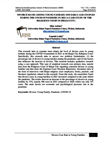 Adrian, Dika (2024) Divorce Rates Among Young Families And Early-Age Couples During The Covid-19 Pandemic In 2021 (A Case Study Of The Religious Court In Binjai City). Indonesian Interdisciplinary Journal of Sharia Economics (IIJSE), 7 (3).