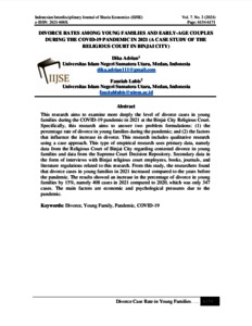 This research aims to examine more deeply the level of divorce cases in young families during the COVID-19 pandemic in 2021 at the Binjai City Religious Court. Specifically, this research aims to answer two problem formulations: (1) the percentage rate of divorce in young families during the pandemic; and (2) the factors that influence the increase in divorce. This research includes qualitative research using a case approach. This type of empirical research uses primary data, namely data from the Religious Court of Binjai City regarding contested divorce in young families and data from the Supreme Court Decision Repository. Secondary data in the form of interviews with Binjai religious court employees, books, journals, and literature regulations related to this research. From this study, the researchers found that divorce cases in young families in 2021 increased compared to the years before the pandemic. The results showed an increase in the percentage of divorce in young families by 15%, namely 408 cases in 2021 compared to 2020, which was only 347 cases. The main factors are economic and psychological pressures due to the pandemic.