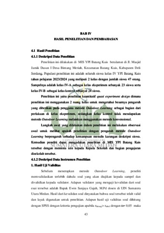 Penelitian yang telah dilakukan berjudul “Pengaruh Metode Outdoor Learning Terhadap Kemampuan Menulis Karangan Deskripsi Siswa Kelas IV di MIS YPI Batang Kuis” dan didasari oleh fenomena bahwa kemampuan untuk menulis masih sangat terbatas, khususnya menulis karangan deskripsi. Dalam hal tersebut dapat mengakibatkan kreativitas siswa tidak dapat berkembang maksimal dan merasa kesulitan dalam menemukan ide atau gagasan baru dalam proses pembelajaran. Metodologi penelitian menggunakan penelitian kuantitatif quasi experiment design. Populasi dalam penelitian ini adalah seluruh siswa kelas IV MIS YPI Batang Kuis yang terdiri IV A dan IV B yang berjumlah 47 siswa. Teknik pengambilan sampel dilakukan dengan Non Probability Sampling, melalui bentuk total sampling (Boring Sampling). Artinya, memilih sampel dengan semua populasi dijadikan sampel dan populasi hanya bisa dua kelas saja. Instrumen penelitian ini berupa tes menulis karangan deskripsi dan dokumentasi. Alat pengolahan data menggunakan uji persyaratan data dan uji t. Hasil penelitian mengungkapkan bahwa (1) diketahui rata-rata pre-test kelas eksperimen sebesar 65,09 sementara rata-rata pretest kelas kontrol sebesar 64,21, (2) diketahui rata-rata posttest kelas eksperimen setelah diberikan treatment berupa pembelajaran menggunakan metode outdoor learning diperoleh sebesar 83,12 sedangkan rata-rata posttest kelas kontrol diberikan treatment berupa pembelajaran konvensional diperoleh rata-rata sebesar 72,54 Dengan demikian dapat dapat disimpulkan bahwa rata-rata posttest kelas eksperimen lebih tinggi dibandingkan rata-rata posttest kelas kontrol. (3) Hasil perhitung uji t diperoleh thitung lebih besar dari ttabel (2,915 > 2,074), sehingga dapat disimpulkan bahwa Ha diterima dan Ho di tolak. Berdasarkan pada temuan penelitian di atas, maka bahwa penggunaan metode outdoor learning dalam proses pembelajaran berpengaruh terhadap kemampuan menulis karangan deskripsi kelas IV YPI Batang Kuis Tahun Ajaran 2023/2024.
