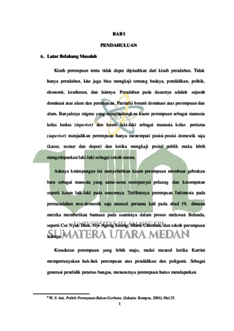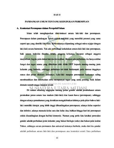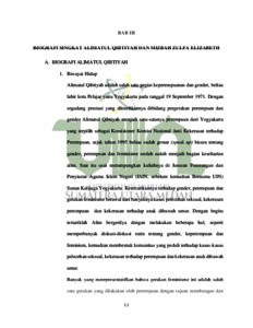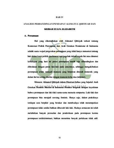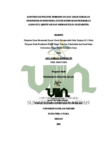 Di dalam Islam ada beberapa isu yang sering diangkat ke permukaan terutama yang berkaitan dengan isu relasi jender. Isu tersebut, antara lain konsep kepemimpinan perempuan, aurat, busana muslimah, persaksian, poligami, hak-hak reproduksi perempuan, peran publik perempuan, dan konsep superioritas laki-laki dan sebagainya. Dalam artikel ini menyuguhkan salah satunya yakni kepemimpinan perempuan dalam perspektif hukum Islam. Jika membaca sepintas beberapa ayat dan hadis tentang hal tersebut, terkesan ada kecenderungan seolah Islam memojokkan perempuan dan mengistimewakan laki-laki. Akan tetapi, jika menyimak secara mendalam dengan menggunakan metode semantik, semiotika dan hermeneutik secara kritis, maka justru sebaliknya, Islamlah yang pertama kali menggagas konsep keadilan jender dalam sejarah, sepanjang kehidupan umat manusia. Melalui artikel ini, akan menjelaskan bagaimana nashnash yang telah diteliti tentang perempuan dan juga dapat meluruskan penafsiran klasik yang terbukti tidak objektif, karena ternyata terkontaminasi oleh kondisi sosial Nama ; Ayu Amelia Rangkuti NIM 0404171004 Jurusan : Pemikiran Politik Islam Judul Skripsi :Kontestasi Politik Perempuan dan Arah Gerakan Feminisme di Indonesia (Studi Komparasi Pemikiran Alimatul Qibtiyah dan Mizbah Zulfa Elizabeth) Pembibing I : Dr. Mardian Idris, M.Ag budaya yang didominasi oleh peran laki-laki, terutama sekali terkait dalam konteks kepemimpinan perempuan. Analisa pemikiran yang dan digunakan tokoh Alimatul Qibtiyah dan Mizbah Zulfa Elizabeth tidak jauh berbeda, hanya saja dalam hal ini Alimatul Qibtiyah lebih mengkerucutkan pembahasan gerakan perempuan dan arah gerakan feminisme ini ke sudut pandang agama dan ajaran pokok agama Islam itu sendiri Sedangkan, Mizbah Zulfa Elizabeth lebih cenderung membahas dan menganalisisnya dalam kajian umum (secara universal).