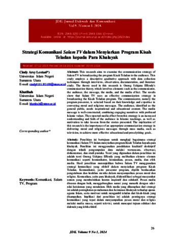 Lestari, Cindy Arsy (2024) Strategi Komunikasi Salam TV dalam Menyiarkan Program Kisah Teladan kepada Para Khalayak. JDK: Jurnal Dakwah dan Komunikasi. ISSN 2548-3293