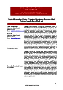 Penelitian ini bertujuan untuk mengkaji bagaimana strategi komunikasi Salam TV dalam menyiarkan program Kisah Teladan kepada para khalayak. Penelitian ini menggunakan pendekatan kualitatif deskriptif dengan teknik pengumpulan data melalui wawancara, observasi, dokumentasi, dan studi pustaka. Teori yang digunakan dalam penelitian ini adalah teori Onong Uchjana Effendy yang melibatkan elemen- elemen komunikasi seperti komunikator, komunikan, pesan, media, dan efek media. Hasil penelitian menunjukkan bahwa Salam TV menggunakan strategi komunikasi yang efektif dalam menyiarkan program Kisah Teladan. Komunikator, yaitu presenter program, dipilih berdasarkan pengetahuan dan keahlian mereka dalam menyampaikan pesan moral dan religius. Komunikan, yaitu para khalayak, diidentifikasi sebagai masyarakat umum yang membutuhkan konten inspiratif dan edukatif. Pesan media disusun dengan baik, menggabungkan narasi yang menarik dengan nilainilai keislaman yang mendalam. Efek media yang diharapkan dari strategi ini adalah peningkatan pemahaman dan keimanan khalayak terhadap ajaran agama Islam, serta motivasi untuk mengambil teladan dari kisah-kisah yang disampaikan. Implikasi dari penelitian ini adalah pentingnya strategi komunikasi yang tepat dalam menyampaikan pesan moral dan religius melalui media massa, seperti televisi, untuk mencapai tujuan edukasi dan dakwah yang lebih efektif.