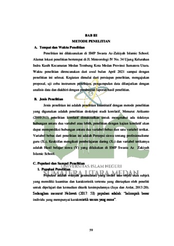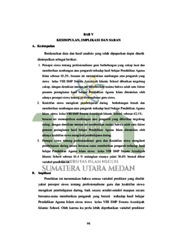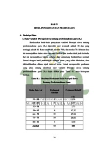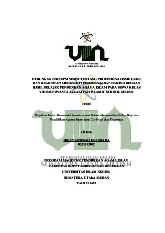 Tesis Hubungan Persepsi Siswa Tentang Profesionalisme Guru Dan Keaktifan Mengikuti Pembelajaran Daring Dengan Hasil Belajar Pendidikan Agama Islam Pada Siswa Kelas VIII SMP Swasta Azzakiyah Islamic School Medan. Penelitian ini bertujuan untuk mengetahui, (1) Hubungan persepsi siswa tentang profesionalisme guru dengan hasil belajar pendidikan agama Islam pada siswa (2) Hubungan keaktifan siswa mengikuti pembelajaran daring dengan hasil belajar pendidikan agama Islam pada siswa, dan (3) Hubungan secara bersamasama antara persepsi siswa tentang profesionalisme guru dan keaktifan mengikuti pembelajaran daring dengan hasil belajar pendidikan agama Islam pada siswa. Jenis penelitian ini adalah penelitian kuantitatif dengan metode penelitian yang digunakan adalah penelitian deskripsi studi korelatif. Alat pengumpulan data menggunakan kusioner berbentuk skala likert. Dengan besaran sampel sebanyak 73 siswa dari jumlah dari jumlah populasi berjumlah 144 siswa. Hasil penelitian menyimpulkan bahwa, (1) Persepsi siswa tentang profesionalisme guru berhubungan yang cukup kuat dan memberikan sumbangan atau pengaruh terhadap hasil belajar pendidikan agama Islam sebesar 65,2%, besaran ini menunjukkan sumbangan atau pengaruh yang diberikan tergolong cukup, dengan demikian temuan ini memberikan makna bahwa salah satu faktor penentu peningkatan hasil belajar pendidikan agama Islam ditentukan oleh adanya persepsi siswa tentang profesionalisme guru siswa, (2) Keaktifan siswa mengikuti pembelajaran daring berhubungan lemah dan memberikan sumbangan atau pengaruh terhadap hasil belajar pendidikan agama Islam siswa sebesar 42,1%, besaran ini menunjukkan sumbangan atau pengaruh yang diberikan tergolong cukup, dengan demikian temuan ini memberikan makna bahwa salah satu faktor penentu peningkatan hasil belajar pendidikan agama Islam ditentukan oleh adanya keaktifan siswa mengikuti pembelajaran daring dan (3) Persepsi siswa tentang profesionalisme guru dan Keaktifan siswa mengikuti pembelajaran daring secara bersama-sama memberikan pengaruh terhadap hasil belajar pendidikan agama Islam siswa sebesar 61,4 % sedangkan sisanya yakni 38,6% berasal diluar variabel penelitian ini.