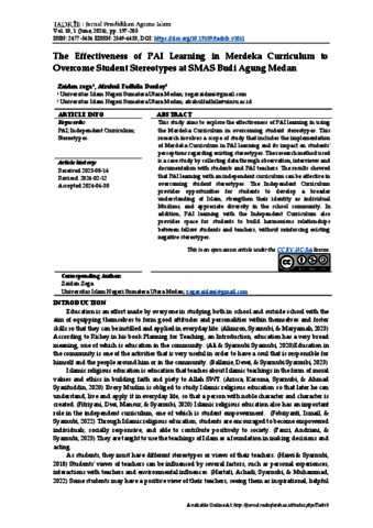 zega, Zaidan (2024) The Effectiveness of PAI Learning in Merdeka Curriculum to Overcome Student Stereotypes at SMAS Budi Agung Medan. Tadrib: Jurnal Pendidikan Agama Islam. ISSN 2477-5436