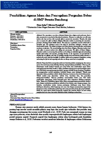 Pergaulan bebas merupakan salah satu bentuk perilaku menyimpang dari norma agama dan sosial yang sering dihadapi disetiap jenjang lembaga pendidikan. Namun, pada kenyatannya masih terdapat banyak guru yang belum bisa memberikan upaya dalam mencegah pergaulan bebas tersebut. Maka, penelitian ini bertujuan untuk mengkaji upaya guru PAI dalam mencegah pergaulan bebas, tepatnya di SMP Swasta Bandung. Penelitian ini menggunakan metode penelitian kualitatif dengan jenis deskriptif. Teknik yang digunakan dalam penelitian adalah teknik observasi, wawancara dan studi dokumentasi. Teknik analisis yang digunakan: reduksi data, visualisasi data, dan penarikan kesimpulan/verifikasi. Temuan penelitian menunjukkan bahwa guru PAI sudah memberikan upaya-upaya untuk mencegah para siswa terjerumus kedalam pergaulan bebas. Upaya guru Pendidikan Agama Islam dalam menanggulangi permasalahan tersebut yaitu dengan melakukan pendekatan individual dan bekerja sama dengan pengajar dan konselor, memberikan arahan tentang pentingnya kehidupan yang damai dalam kehidupan sehari-hari, tidak berperang satu sama lain dengan menanamkan empati dan keragaman sosial, memberikan sanksi bagi siswa yang merokok, bolos dan yang berkelahi. Selain itu, upaya seperti sholat berjamaah, mengaji dan menulis Al-Qur`an serta saling menghormati satu sama lain selalu dilakukan dalam kehidupan sehari-hari.