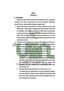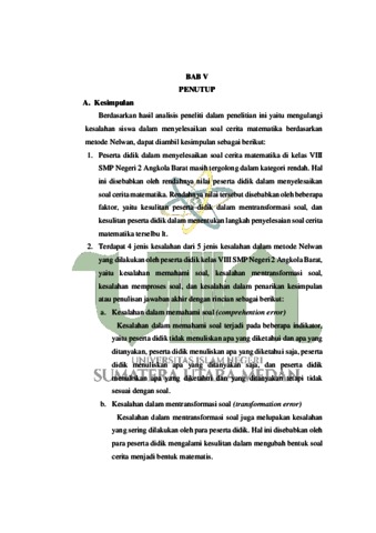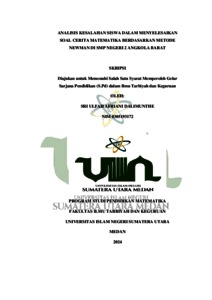 Penelitian ini berjudul “Analisis Kesalahan Siswa Dalam Menyelesaikan Soal Cerita Matematika Berdasarkan Metode Newman di SMP Negeri 2 Angkola Barat” dilatarbelakangi bahwa kemampuan siswa dalam menyelesaikan soal cerita matematika masih tergolong rendah. Penelitian ini adalah penelitian yang menggunakan metode pendekatan deskriptif kualitatif yang bertujuan untuk menggambarkan secara utuh dan mendalam mengenai sesuatu yang kita teliti atau kita amati. Penelitian dengan metode deskriptif kualitatif akan menghasilkan data deskripsi berupa kata-kata maupun gambar dari yang kita teliti atau amati. Hasil penelitian mengungkapkan bahwa peneliti menemukan jenisjenis kesalahan berbeda yang dilakukan oleh peserta didik pada tiap butir soal menurut metode Newman. Adapun kesalahan-kesalahan yang dilakukan oleh para siswa tersebut dalam menyelesaikan soal cerita matematika adalah kesalahan dalam membaca soal dilakukan sebanyak 0 kesalahan, kesalahan dalam memahami soal dilakukan sebanyak 28 kesalahan, kesalahan dalam mentransformasi soal dilakukan sebanyak 38 kesalahan, kesalahan dalam memproses soal dilakukan sebanyak 38 kesalahan dan kesalahan dalam penarikan kesimpulan dilakukan sebanyak 38 kesalahan. Berdasarkan hasil penelitian diatas maka dapat disimpulkan bahwa proses peserta didik dalam menyelesaikan soal cerita matematika masih tergolong rendah. Terdapat 4 jenis kesalahan dari 5 jenis kesalahan dalam metode Newman yang dilakukan oleh peserta didik kelas VIII SMP Negeri 2 Angkola Barat yaitu kesalahan dalam memahami soal, kesalahan dalam mentransformasi soal, kesalahan dalam memproses soal, dan kesalahan dalam penarikan kesimpulan.