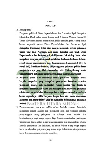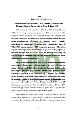 Pelayanan publik merupakan layanan yang disediakan oleh pemerintah kepada warga negara atau masyarakat untuk memenuhi kebutuhan dasar dan meningkatkan kualitas hidup mereka. Namun pelayanan publik yang berada di dalam masyarakat seringkali mengahadapi berbagai tantangan seperti yang terjadi di lapangan. Pemerintah seringkali dihadapkan pada keterbatasan anggaran untuk menyediakan pelayanan publik yang berkualitas. Birokrasi yang berbelit-belit dan kurangnya efisiensi dalam administrasi publik dapat menghambat penyampaian layanan kepada masyarakat. Tidak semua anggota masyarakat memiliki akses yang sama terhadap pelayanan publik, terutama di daerah terpencil atau bagi kelompok minoritas. Undang-Undang Nomor 25 Tahun 2009 tentang Pelayanan Publik adalah dasar hukum yang mengatur penyelenggaraan pelayanan publik di Indonesia. Undang-undang ini bertujuan untuk menciptakan tata kelola pelayanan publik yang transparan, akuntabel, dan berorientasi pada kepuasan masyarakat. Tujuan utama pelayanan publik adalah untuk memastikan kesejahteraan masyarakat, meningkatkan kualitas hidup, dan menciptakan kondisi yang mendukung perkembangan sosial, ekonomi, dan budaya. Metode dalam penulisan ini adalah yuridis empiris (penelitian lapangan) yaitu suatu penelitian yang meneliti objek di lapangan untuk mendapatkan data yang jelas tentang permasalahan yang akan dikaji dan diteliti. Teknik pengumpulan data dilakukan dengan cara mewawancarai, mengobservasi dan mendokumentasikan yang berkaitan dengan pelayanan pembuatan akta kelahiran dengan meninjau semua data yang dikumpulkan yang didukung oleh hasil wawancara. Berdasarkan hasil penelitian dapat diketahui bahwa efektivitas pelaksanaan pelayanan pembuatan akta kelahiran di Disdukcapil Kabupaten Mandailing Natal sudah berjalan cukup efektif dan sudah sesuai dengan Undang-Undang Nomor 25 Tahun 2009 meskipun ada beberapa dari indikator yang masih belum terpenuhi, dibandingkan dari tahun-tahun sebelumnya, namun Dinas Kependudukan dan Pencatatan Sipil Kabupaten Mandailing Natal tetap mengupayakan untuk memenuhi kriteria pelayanan publik yang baik dan mampu mengayomi masyarakat semaksimal v mungkin dengan memberikan jaminan kemudahan layanan dan melakukan terobosan-terobosan terbaru.
