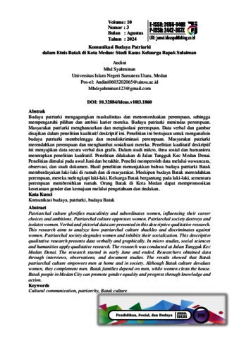 Andini, Andini (2024) Komunikasi Budaya Patriarki dalam Etnis Batak di Kota Medan: Studi Kasus Keluarga Bapak Sulaiman. Jurnal IDEAS Pendidikan, Sosial, dan Budaya.