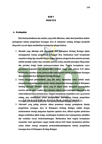 Permasalahan kinerja pengelolaan keuangan merupakan permasalahan yang saat ini terjadi di Indonesia. Berdasarkan data ICW ada 155 kasus dengan 252 tersangka yang terjadi di desa yaitu terkait dengan pengelolaan keuangan desa dari proses perencanaan, pelaksanaan, penatausahaan, pelaporan dan pertanggungjawaban. Penelitian ini bertujuan untuk: (1) Mengetahui permasalahan dalam menerapkan pengelolaan keuangan desa; (2) Solusi untuk mengatasi permasalahan pengelolaan keuangan desa; (3)strategi yang tepat untuk menerapkan pengelolaan keuangan desa. Penelitian ini menggunakan metode Analytic Network Process (ANP) dan bantuan software Super Decision. Hasil penelitian menunjukkan bahwa: (1) Permasalah yang dihadapi oleh pemerintah Kabupaten Serdang Bedagai berdasarkan hasil kesepakatan respoden sebagai berikut prioritas pertama adalah masalah sumber daya manusia, prioritas kedua masalah partisipasi Masyarakat dan prioritas ketiga badan permusyawaratam desa. Tingkat kesepakatan (rater agreement) responden atas permasalahan tersebut tinggi yaitu sebesar 0,43 ; (2) Untuk mengatasi permasalahan yang ada maka, diputuskan solusi terbaik untuk mengatasi permasalahan peningkatan kinerja pengelolaan keuangan desa di Kabupaten Serdang Bedagai. Prioritas utama yang di dapati untuk mengatasi permasalahan tersebut adalah solusi sumber daya manusia, diikuti solusi partisipasi Masyarakat dan solusi badan permusyawaratan desa. Tingkat kesepakatan responden (rater agreement) sedang atas menentukan solusi permasalahan peningkatan kinerja pengelolaan keuangan desa di pemerintah desa Kabupaten Serdanga Bedagai sebesar 0,23; (3) Alternatif yang paling prioritas dalam penentuan strategi peningkatan kinerja pengelolaan keuangan desa di Kabupaten Serdang Bedagai adalah dengan melaksanakan strategi penguatan kapasitas aparatur desa, diikuti regulasi perekrutan dengan melibatkan pihak ketiga, membangun komitmen dan terprogramnya pelatihan dan sosialiasi secara berkesinambungan. Berdasarkan hasil tingkat kesepakatan responden (rater agreement) sangat rendah sebesar 0,02 dalam menentukan prioritas utama dalam strategi mengatasi permasalahan peningkatan kinerja pengelolaan keuangan desa di Kabupaten Serdang Bedagai. Berdasarkan hasil perspektif maqashid syariah dalam hukum tata niaga, kinerja pengelolaan keuangan desa berdasarkan ar rawaj pemerintah desa sudah melaksanakan pendistribusian dana desa sesuai dengan RPJMDes; berdasarkan transparansi, pemerintah desa sudah melaksanakan dengan di publikasikan laporan keuangan desa di papan pengumuman desa; berdasarkan perlindungan terhadap harta kekayaan, Masyarakat desa, pemerintah desa dan pemerintah kabupaten/kota, POLRI dan SATGAS; berdasarkan kekuatan hukum, pengelolaan keuangan desa dilakukan oleh PKPKD belum terlaksana dengan maksimal; berdasarkan keadilan, pemerolehan harta sesuai dengan alokasi formula.