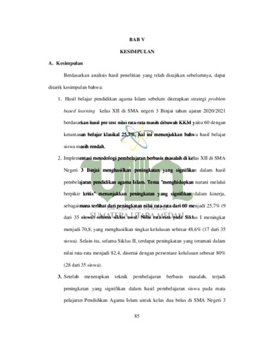Penelitian ini dilatarbelakangi oleh rendahnya hasil belajar siswa dalam mengikuti pembelajaran pendidikan agama Islam, hal ini dapat dilihat dari proses belajar yang menunjukkan rendahnya hasil belajar siswa, sehingga nilai yang diperoleh siswa dibawah KKM yang sudah diterapkan sekolah. Tujuan penelitian ini adalah untuk mengetahui penerapan strategi problem based learning dalam meningkatkan hasil belajar siswa kelas XII SMA N 3 Binjai. Jenis penelitian ini adalah penelitian tindakan kelas, dengan subjek penelitian di kelas XII terdiri dari 35 siswa. Berdasarkan hasil penelitian dapat diketahui bahwa adanya peningkatan hasil belajar sebelum dilakukan tindakan siklus I dan siklus II. Hasil belajar sebelum dilakukan tergolong rendah dan kurang baik dengan rata-rata 60 dengan ketuntasan 25,7% dengan jumlah 9 siswa yang tuntas dan hasil belajar siswa mengalami peningkatan pada siklus I dengan rata-rata 70,8 dengan ketuntasan 48,6% dengan jumlah 17 siswa yag tuntas. Hasil belajar siklus II yaitu dengan ratarata 82,4 dengan ketuntasan 80% dengan jumlah 28 siswa yang tuntas. Dengan demikian dapat disimpulkan bahwa pembelajaran problem based learning dapat meningkatkan hasil belajar siswa pada mata pelajaran pendidikan agama Islam di kelas XII SMA N 3 Binjai.