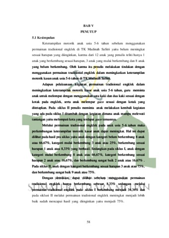 Penelitian ini bertujuan untuk mendeskripsikan: 1) Keterampilan motorik kasar anak usia 5-6 tahun sebelum melakukan kegiatan permainan tradisional engklek. 2) Keterampilan motorik kasar anak 5-6 tahun pada saat menggunakan kegiatan tradisional engklek. 3) Keterampilan motorik kasar anak usia 5-6 tahun setelah menggunakan permainan tradisional engklek. Jenis penelitian yang digunakan oleh penulis yaitu PTK (penelitian tindakan kelas). Subjek dalam penelitian ini adalah seluruh anak usia 5-6 tahun di TK Madinah Safitri yang berjumlah 12 orang. Hasil penelitian ini menunjukkan bahwa: 1) Keterampilan motorik anak usia 5-6 tahun sebelum menggunakan permainan tradisional engklek di TK Madinah Safitri yaitu belum meningkat sesuai harapan yang diinginkan karena hanya 1 anak yang berkembang sesuai harapan, 3 anak yang mulai berkembang dan 8 anak yang belum berkembang. 2) Pelaksanaan kegiatan permainan tradisional engklek dalam meningkatkan keterampilan motorik kasar anak usia 5- 6 tahun, guru meminta anak untuk melompat dengan menggunakan satu kaki dan dua kaki sesuai dengan kotak pada engklek, serta anak melempar gaco sesuai dengan kotak yang ditetapkan. 3) Melalui permainan tradisional engklek pada anak usia 5-6 tahun maka perkembangan keterampilan motorik kasar anak dapat meningkat. Hal ini dapat dilihat pada hasil pra siklus yaitu anak dengan kategori belum berkembang 8 anak atau 66,67%, kategori mulai berkembang 3 anak atau 25%, berkembang sesuai harapan 1 anak atau 8,33% yang berhasil. Sedangkan pada siklus I, anak dengan kategori mulai berkembang 8 anak atau 66,67%, kategori berkembang sesuai harapan 2 anak atau 16,67%, dan berkembang sangat baik 2 anak atau 16,67% . Pada siklus II, anak dengan kategori berkembang sesuai harapan 3 anak atau 75%, dan berkembang sangat baik 9 anak atau 75%.