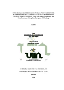 Industri adalah kegiatan ekonomi yang mengelola bahan mentah, produksi barang, atau penyediaan jasa. Industri biasanya melibatkan produksi dalam skala besar menggunakan teknologi, mesin, dan tenaga kerja untuk memenuhi kebutuhan pasar. Sedangkan industri rumah tangga adalah suatu unit usaha atau kegiatan uhasa dalam skala kecil yang bergerak dalam bidang industri tertentu. Rumahan berarti rumah, tempat tinggal ataupun kampung halaman. Sedangkan industri dapat diartikan sebagai kerajinan, usaha produk barang atau perusahaan. Singkatnya Industry Rumahan adalah usaha rumah yang membuat produk/barang dalam jumlah kecil. Dikatakan sebagai usaha kecil karena jenis kegiatan ekonomi ini berpusatkan dirumah. Adapun masalah dalam penelitian ini adalah bagaimana Jumlah Produksi dan Biaya Produksi berpengaruh terhadap kesejahteraan masyarakat di Desa Baru Kecamatan Batang kuis, Kabupaten Deli Serdang, dan Bagaimana Peran Industri Rumahan dalam persfektif ekonomi islam di desa Baru Kecamatan Batang Kuis, Kabupaten Deli Serdang. Tujuan penelitian ini adalah untuk mengetahui bagaimana peran Usaha Rumahan terhadap kesejahteraan masyarakat dalam perfektif ekonomi islam. Penelitian ini bersifat Kuantitatif, Data penelitian ini adalah data primer yang diperoleh langsung dari sumber pertama baik dari individu maupun perorangan seperti hasil hasil pengisian kuesioner dan observasi. Teknik analisis data yang digunakan adalah analisis regresi linier berganda dengan menggunakan software SPSS (Statistical Package For Sosial Science) 16. Hasil penelitian yang dilakukan menunjukkan bahwa (1) Jumlah Produksi berpengaruh Positif dan signifikan terhadap kesejahteraan Masyarakat di Desa Baru Kecamatan Batang Kuis Kabupaten Deli Serdang. (2) Biaya Produksi berpengaruh negatif dan tidak signifikan terhadap kesejahteraan masyarakat di Desa Baru Kecamatan Batang Kuis Kabupaten Deli Serdang.