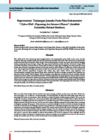 Sari, Sri Indah (2024) Representasi Tantangan Jurnalis Pada Film Dokumenter “Cyber Hell : Exposing An Internet Horror” (Analisis Semiotika Roland Barthes). Jurnal Indonesia : Manajemen Informatika dan Komunikasi.