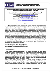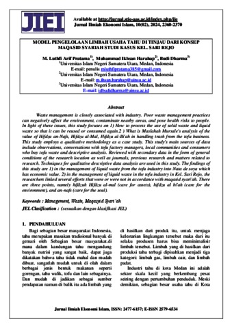 Pratama, M. Luthfi Arif (2024) Model Pengelolaan Limbah Usaha Tahu Di Tinjau Dari Konsep Maqasid Syariah Studi Kasus Kel. Sari Rejo. Jurnal Ilmiah Ekonomi Islam.