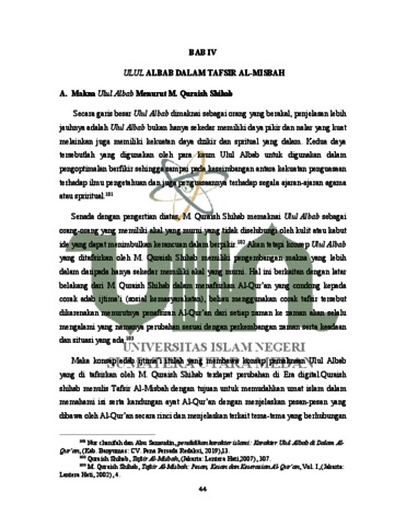 Penelitian ini berjudul “Ulul Albab dalam Tafsir Al-Misbah dan Efektivitasnya terhadap stabilitas moral di era digital” yakni sosok yang memiliki kecerdasan serta kejernihan dalam berfikir dan memiliki akhlak yang mulia serta senantiasa melakukan tazakkur dan tafakkur secara bersamaan mereka tidak luput untuk senantiasa mengingat dan mendekatkan diri kepada Allah. Namun pada era ini kita melihat bahwa manusia menjadikan teknologi sebagai acuan untuk melakukan segala hal dan tidak menggunakan akal dengan sebaiknya, sosok Ulul Albab sudah sangat langka didunia ini padahal kehadiran kelompok ini sangat diharapkan untuk tampil memberi arah moral dan memberi penyelesaian masalahmasalah kritis yang dihadapi dunia dan kemanusiaan, Tujuan dari penelitian ini Untuk mengetahui secara lebih dalam mengenai makna dan karakter insan Ulul Albab dan Untuk mengetahui efektivitas Ulul Albab dalam melakukan stabilitas moral di era digital Metode yang digunakan dalam penelitian ini adalah metode kualitatif, dengan mengumpulkan fenomena atau data mengenai tentang insan Ulul Albab, dan juga menggunakan metode kepustakaan (Library Research) dengan pendekatan deskriptif analisis (Descriptive Analyze) yaitu dengan menggunakan gambaran atau sebuah keadaan suatu obyek atau subyek berdasarkan fakta-fakta yang tampak. Adapun teknik pengumpulan data yang digunakan adalah dengan menguunakan metode dokumentasi dengan mengumpulkan bahasan-bahasan yang terkait dengan penelitian dari berbagai sumber seperti buku, jurnal dan artikel. Hasil Penelitian ini menunjukkan bahwa sosok Ulul Albab memiliki peran penting di Era digital ini karena dengan kejernihan akal, kesucian hati, tingkat keilmuan yang tinggi yang dimilikinya , mampu membawa kepada kebaikan, kedamaian, kemashlahatan umat serta ketenangan jiwa.