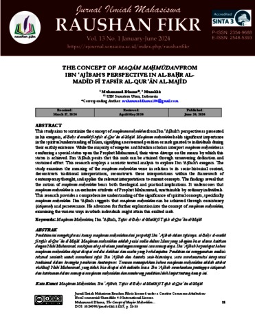 Dhama, Muhammad The Concept Of Maqām Maḥmūdan From Ibn ʻajībah’s Perspective In Al-Baḥr Almadīd Fī Tafsīr Al-Qurʼān Al-Majīd. urnal Ilmiah Mahasiswa Raushan Fikr is licensed under a Creative Commons AttributionNonCommercial-ShareAlike 4.0 International License..