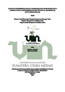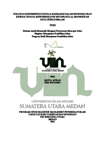 Anwar, Saiful (2024) Strategi Kepemimpinan Kepala Madrasah dalam Meningkatkan Kinerja Tenaga Kependidikan di MTS Swasta Al-Mansuriyah Kota Subulussalam. Masters thesis, Universitas Islam Negeri Sumatera Utara Medan.