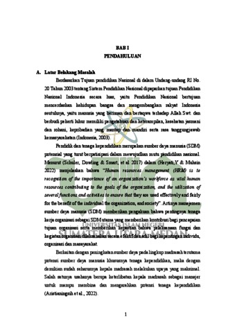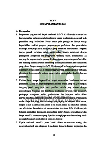 Penelitian ini berjudul "Strategi Kepala Madrasah dalam Meningkatkan Kinerja Tenaga Kependidikan di MTs Al-Mansuriyah". Tujuan dari penelitian ini adalah untuk mengidentifikasi dan menganalisis (1) Program yang dirancang Kepala Madrasah untuk meningkatkan kinerja Tenaga Kependidikan, (2) Kinerja tenaga kependidikan di MTs Swasta Al-Mansuriyah, (3) Strategi yang dijalankan kepala madrasah dalam meningkatkan kinerja tenaga kependidikan. Metode penelitian ini menggunakan jenis studilapangan (field study) dengan menggunakan sudut pandang kualitatif dengan model deskriptif dengan teknik wawancara, observasi dan studi dokumentasi. Sumber data adalah kepala sekolah dan tenaga kependidikan di MTs Al-Mansuriyah. Hasil penelitian menunjukkan bahwa kepala madrasah menerapkan beberapa strategi utama untuk meningkatkan kinerja tenaga kependidikan, antara lain: pelatihan dan pengembangan profesional, peningkatan motivasi kerja, pembinaan dan pengawasan yang efektif. Selain itu, kepala madrasah juga mendorong kolaborasi dan komunikasi yang baik antar tenaga kependidikan untuk menciptakan lingkungan kerja yang kondusif. Program jangka panjang difokuskan pada pengembangan infrastruktur dan teknologi informasi untuk mendukung pembelajaran modern dan administrasi yang efisien. Penelitian ini menyimpulkan bahwa strategi-strategi tersebut efektif dalam meningkatkan kinerja tenaga kependidikan, yang pada gilirannya berkontribusi terhadap peningkatan kualitas pendidikan di MTs Al-Mansuriyah.