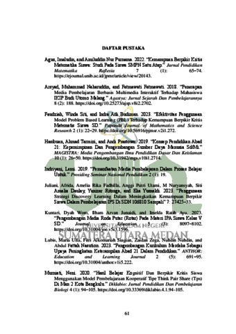 Penelitian yang telah dilakukan berjudul “Pengaruh Penggunaan Permainan Roda Putar Terhadap Kemampuan Berpikir Kritis Pada Pembelajaran IPA MIN 12 Kota Medan”, yang dilatar belakangi bahwa hasil keterampilan berpikir kritis peserta didik pada mata pelajaran IPA tidak memuaskan dan kegiatan pembelajaran yang berlangsung masi menggunakan metode ceramah dan pembelajaran konvensional. Metodologi penelitian menggunakan pendekatan kuantitatif dengan jenis penelitian Quasy Eksperiment bentuk Nonequivalent Control Group Desaign. Penelitian ini dilaksanakan di MIN 12 Kota Medan. Populasi penelitian ini seluruh siswa kelas V MIN 12 Kota Medan, sampel yang digunakan sebanyak 44 siswa, yang terdiri dari 2 kelas dan instrument tes yang digunakan berbentuk esay. Jenis analisis data yang dilakukan dengan analisis uji t-(test) Paired Samples Statistics. Hasil penelitian mengungkapkan bahwa penggunaan media permainan roda putar berpengaruh terhadap kemampuan berpikir kritis siswa, siswa yang diajarkan menggunakan pendekatan konvensional memperoleh nilai rata-rata pretest 46,36. Hasil berlajar belajar siswa yang menggunakan media permainan roda putar memperoleh nilai rata-rata posttest 78,18. Hal ini terdapat pengaruh yang signifikan pada media permainan roda putar terhadap kemampuan berpikir siswa dibuktikan dengan Paired Samples Statistics hasil dengan nilai bahwa nilai sig lebih rendah dai 0,05. Artinya (0,000 < 0,05) artinya Ha diterima dan Ho ditolak Berdasarkan pada temuan penelitian di atas maka media permainan roda putar ini efektif dalam meningkatkan kemampuan berpikir kritis siswa Kelas V MIN 12 Kota Medan pada materi pengelompokkan hewan berdasarkan jenis makanannya.
