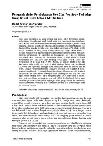 ikap sosial merupakan hal yang penting bagi siswa dalam berinteraksi dengan lingkungannya. Kenyataannya masih banyak siswa yang mempunyai sikap sosial yang lemah, kurang peduli terhadap temannya, kurang peka terhadap lingkungan dan kurang kerjasama. Penelitian ini bertujuan untuk mengetahui pengaruh model pembelajaran Two Stay Two Stray terhadap perilaku sosial siswa dalam pembelajaran IPS di Kelas V MIS Mutiara. Penelitian ini menggunakan metode eksperimen dengan desain kelompok unequal. Instrumen yang digunakan adalah angket sikap sosial dengan skala likert. Data dianalisis menggunakan uji normalitas, uji homogenitas, uji t dan uji Koefisien Determinasi. Hasil penelitian ini disimpulkan bahwa terdapat pengaruh Model Pembelajaran Two Stay Two Stray Terhadap Sikap Sosial Peserta Didik Pada Pembelajaran IPS Di Siswa Kelas V MIS Mutiara, hal tersebut diketahui dari nilai signifikasinsi yaitu 0.000, dari hasil tersebut diketahui bahwa nilai signifikasini 0.000<0.05 taraf siginifikan. Sehingga dapat disimpulkan bahwa Ha diterima dan Ho ditolak. Adapun Koefisien determinasi (R square) sebesar 0.013, yang berarti bahwa pengaruh model two stay two stray terhadap Sikap Sosial adalah sebesar 1,3%. Implikasi dari penelitian ini adalah bahwa penerapan model pembelajaran Two Stay Two Stray dapat menjadi strategi efektif dalam mengembangkan sikap sosial siswa di sekolah dasar, serta mendukung pembelajaran yang lebih inklusif dan kolaboratif. Hal ini dapat membantu guru dalam menciptakan lingkungan belajar yang kondusif dan mendorong interaksi positif antar siswa, yang pada akhirnya berkontribusi pada perkembangan sosial dan emosional mereka.