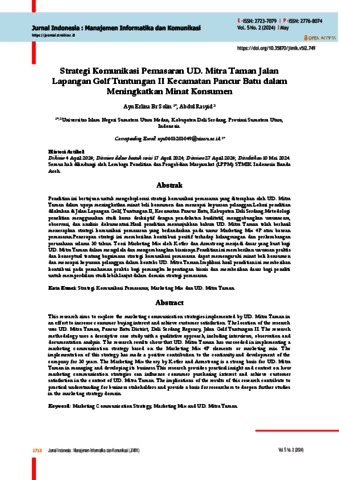 Br Solin, Ayu Erlina (2024) Strategi Komunikasi Pemasaran UD. Mitra Taman Jalan Lapangan Golf Tuntungan II Kecamatan Pancur Batu dalam Meningkatkan Minat Konsumen. Jurnal Indonesia : Manajemen Informatika dan Komunikasi, 5 (2). pp. 1713-1725. ISSN 2723-7079