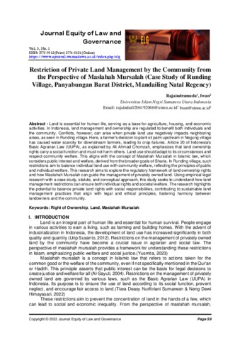 Muda, Raja Indra (2024) Restriction of Private Land Management by the Community from the Perspective of Maslahah Mursalah (Case Study of Runding Village, Panyabungan Barat District, Mandailing Natal Regency). Journal Equity of Law and Governance, 5 (1). pp. 59-64. ISSN ISSN: 2775-9512 (Print) 2776-5121 (Online)