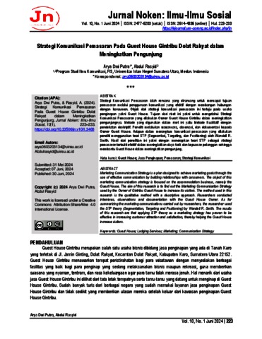 Putra, Arya Dwi (2024) Strategi Komunikasi Pemasaran Pada Guest House Gintribu Dolat Rakyat dalam Meningkatkan Pengunjung. Jurnal Noken: Ilmu-Ilmu Sosial, 10 (1). ISSN 2614-4336