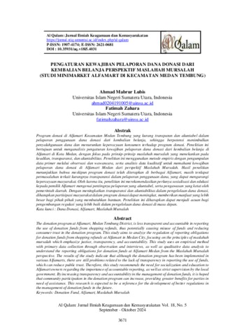 Lubis, Ahmad Mabrur and Zahara, Fatimah (2024) PENGATURAN KEWAJIBAN PELAPORAN DANA DONASI DARI KEMBALIAN BELANJA PERSPEKTIF MASLAHAH MURSALAH (STUDI MINIMARKET ALFAMART DI KECAMATAN MEDAN TEMBUNG). Al Qalam: Jurnal Ilmiah Keagamaan dan Kemasyarakatan, 18 (5). pp. 3671-3685. ISSN p- ISSN1907-4174, e- ISSN 2621-0681