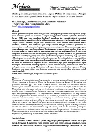 Chaniago, Alia and Soemitra, Andri and Bi Rahmani, Nur Ahmadi (2024) Strategi Meningkatkan Kualitas Agen Dalam Memperkuat Pangsa Pasar Asuransi Syariah Di Indonesia : Systematic Literatur Riview. Madania: Jurnal Ilmu-ilmu Keislaman, 14 (2). pp. 158-171. ISSN P-ISSN : 2088-3226; E-ISSN : 2620-8210