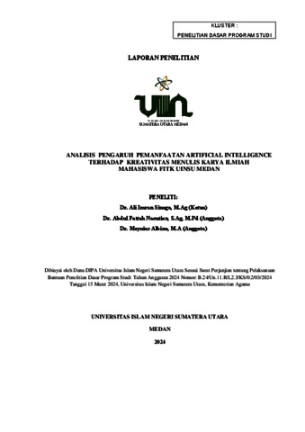 Sinaga, Ali Imran and Nasution, Abdul Fattah and Albina, Meyniar (2024) Analisis Pengaruh Pemanfaatan Artificial Intelligence Terhadap Kreativitas Menulis Karya Ilmiah Mahasiswa FITK UINSU Medan. Universitas Islam Negeri Sumatera Utara.