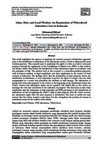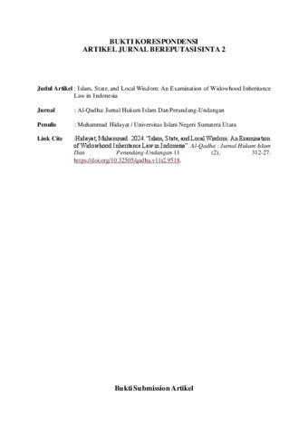 Hidayat, Muhammad (2024) Islam, State, and Local Wisdom: An Examination of Widowhood Inheritance Law in Indonesia. Al-Qadha: Jurnal Hukum Islam dan Perundang-Undangan, 11 (2). pp. 312-327. ISSN p-ISSN 2356-1637 | e-ISSN 2581-0103