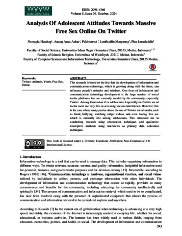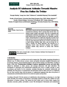 Harahap, Nursapia and Azhar, Anang Anas and Fakhrurrozi, Fakhrurrozi and Marpaung, Jamiluddin and Jamaluddin, Fina (2024) Analysis of Adolescent Attitudes Towards Massive Free Sex Online on Twitter. Waiguo Yuyan yu Wenhua, 8 (6). ISSN 2096-4366