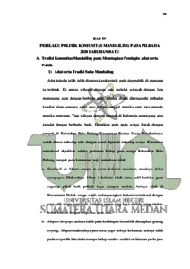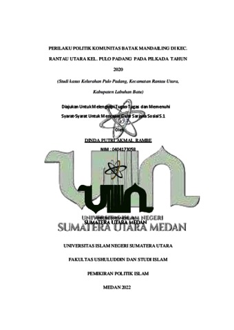 AKMAL RAMBE, DINDA PUTRI (2022) Perilaku Politik Komunitas Batak Mandailing Di Kec. Rantau Utara Kel. Pulo Padang Pada Pilkada Tahun 2020”. Skripsi thesis, UIN SU Medan.