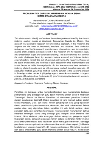 Nelliana, Nelliana Problematika Guru Dalam Membina Akhlak Siswa Di Mts Swasta Ira Medan. Jurnal Ilmiah Pendidikan Dasar. ISSN 2548-6950