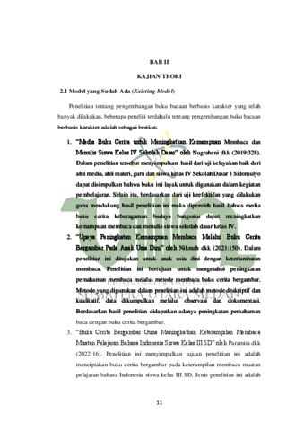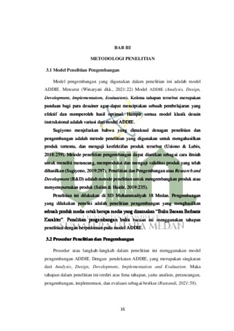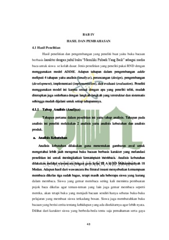 Penelitian yang telah dilakukan berjudul “Pengembangan Buku Bacaan Berbasis Karakter Untuk Meningkatkan Kemampuan Membaca Siswa Di Kelas 3 SD Muhammadiyah 18 Medan”. Pengembangan buku bacaan yang mana sebagai media menunjang pembelajaran memiliki hubungan yang luas antara tulisan, gambar, dan lainnya. Buku bacaan berbasis karakter ini didalamnya terdapat narasi teks secara singkat yang dihubungankan dengan gambar berwarna dan kosa kata yang dapat disampaikan lewat ilustrasi maupun teks. Penelitian ini merupakan jenis penelitian RND dengan menggunakan model ADDIE. Model penelitian ini yaitu model pengembangan ADDIE, yaitu (1) Analyze (2) Design (3) Develop (4) Implement (5) Evaluate. Penelitian ini dilakukan di SD Muhammadiyah 18 Medan. Data penelitian ini diperoleh dari validasi materi, media, dan bahasa, serta diperoleh juga data dari angket respon guru, angket respon peserta didik dan tes kemampuan membaca. Alat pengelola data menggunakan rumus N-Gain. Hasil penelitian menunjukkan bahwa (1) buku bacaan berbasis karakter untuk meningkatkan kemampuan membaca yang dikembangkan, diperoleh data dari validator ahli media dengan persentase 80% kategori valid, validator ahli materi dengan persentase 80% pada kategori valid dan validator ahli bahasa dengan persentase 80% pada kategori valid, (2) Hasil angket respon siswa diperoleh data persentase dari respon siswa uji terbatas di kelas III SD Muhammadiyah 18 Medan, dengan persentase 88% pada kategori sangat praktis dan uji kelompok besar 91%. Dengan demikian buku cerita bergambar yang dikembangkan praktis (3) Keefektifan buku bacaan dilihat dari hasil tes dan diperoleh data hasil uji lapangan di kelas III SD Muhammadiyah 18 Medan, dengan persentase rata-rata nilai siswa N Gain 84% pada kategori Efektif