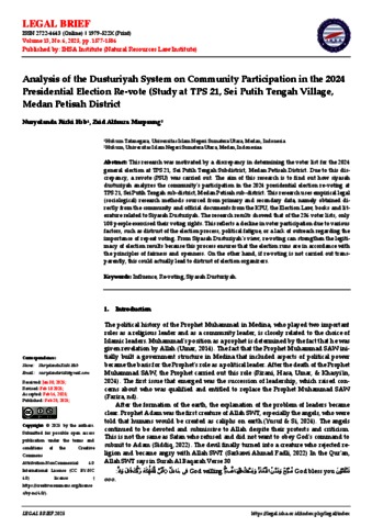 Rizki, Nuryolanda and Alfauza, Zaid Analysis of the Dusturiyah System on Community Participation in the 2024 Presidential Election Re-vote (Study at TPS 21, Sei Putih Tengah Village, Medan Petisah District. LEGAL BRIEF ISSN 2722-4643 (Online) | 197.