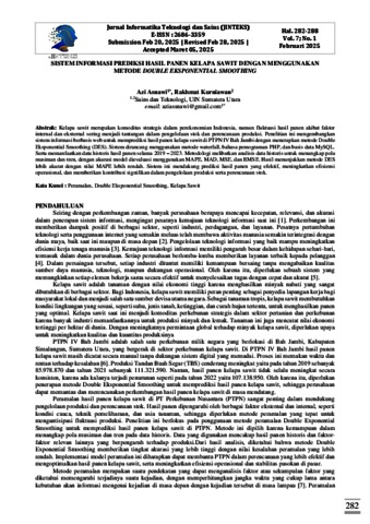 Asnawi, Azi and Kurniawan, Rakhmat Sistem Informasi Prediksi Hasil Panen Kelapa Sawit Dengan Menggunakan Metode Double Eksponential Smoothing. Jurnal Informatika Teknologi dan Sains (JINTEKS).