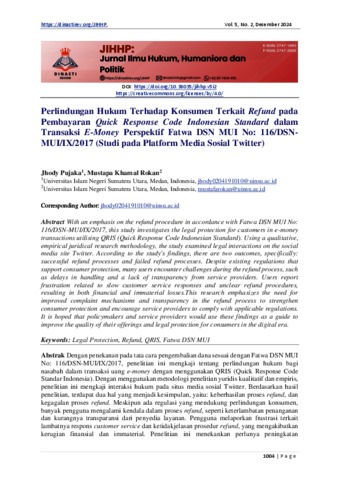 Pujaka, Jhody and Khamal, Mustapa Perlindungan Hukum Terhadap Konsumen Terkait Refund pada Pembayaran Quick Response Code Indonesian Standard dalam Transaksi E-Money Perspektif Fatwa DSN MUI No: 116/DSN MUI/IX/2017 (Studi pada Platform Media Sosial Twitter). JIHHP: Jurnal Ilmu Hukum, Humaniora dan Politik.