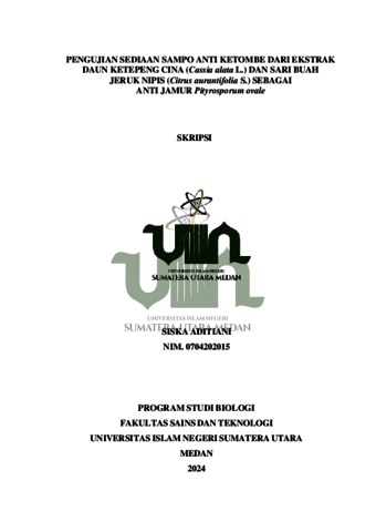 Aditiani, Siska (2024) Pengujian Sediaan Sampo Anti Ketombe Dari Ekstrak Daun Ketepeng Cina (Cassia Alata L.) Dan Sari Buah Jeruk Nipis (Citrus Aurantifolia S.) Sebagai Anti Jamur Pityrosporum Ovale. Skripsi thesis, universitas islam negeri sumatera utara.