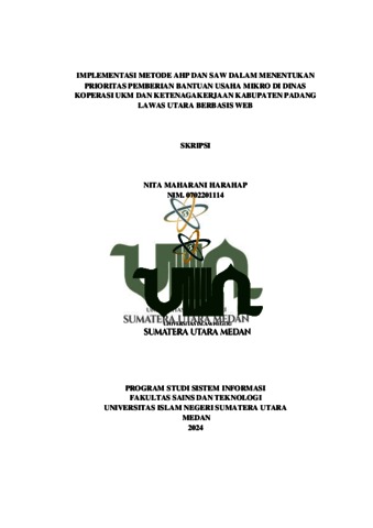 Maharani, Nita (2024) Implementasi Metode Ahp Dan Saw Dalam Menentukan Prioritas Pemberian Bantuan Usaha Mikro Di Dinas Koperasi Ukm Dan Ketenagakerjaan Kabupaten Padang Lawas Utara Berbasis Web. Skripsi thesis, universitas islam negeri sumatera utara.