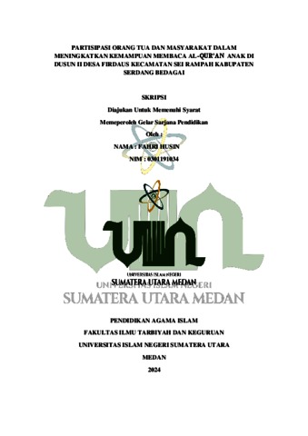 Husin, Fahri (2024) Partisipasi Orang Tua Dan Masyarakat Dalam Meningkatkan Kemampuan Membaca Al-Qur’an Anak Di Dusun Ii Desa Firdaus Kecamatan Sei Rampah Kabupaten Serdang Bedagai. Skripsi thesis, universitas islam negeri sumatera utara.