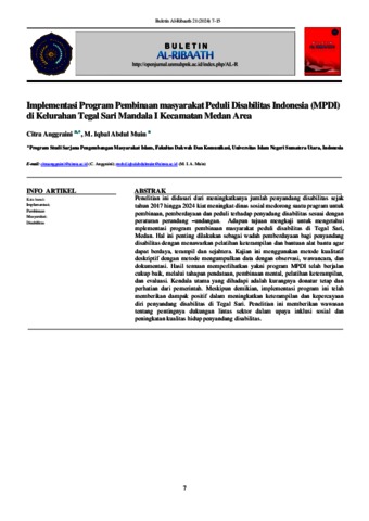 Anggraini, Citra and Muin, M. Iqbal Abdul Implementasi Program Pembinaan masyarakat Peduli Disabilitas Indonesia (MPDI) di Kelurahan Tegal Sari Mandala I Kecamatan Medan Area. Buletin Al-Ribaath 21 (2024) 7-15.