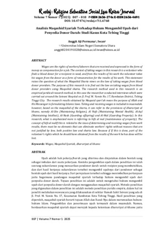 Permana, Anggit Aji and Iwan, Iwan Analisis Maqashid Syariah Terhadap Hukum Mengambil Upah dari Penyedia Donor Darah: Studi Kasus Kota Tebing Tinggi. R eslaj: Religion Education Social Laa Roiba Journal.