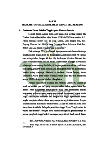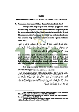 Penelitian ini menggambarkan kebiasaan atau kegiatan penerapan dalam penggunaan sutrah ketika salat di lingkungan STAI As-Sunnah Deli Serdang sebagai suatu fenomena living hadis. Banyak hadis Nabi صلى الله عليه وسلم yang menganjurkan untuk menggunakan sutrah dalam salat. Akan tetapi, kebanyakan masyarakat umum tidak melaksanakan anjuran Nabi صلى الله عليه وسلم ini dikarenakan beberapa faktor diantaranya, ketidaktahuan mereka akan hadis dan hukum sutrah tersebut serta anggapan bahwa amalan ini hanya sebatas amalan sunnah, sehingga tidak ada kewajiban untuk melaksanakannya. Berbeda dengan keadaan masyarakat STAI As-Sunnah, walaupun terjadi perbedaan pendapat terkait hukum menggunakan sutrah saat salat. Akan tetapi, mereka beranggapan bahwa kebiasaan ini merupakan sebuah pengamalan dari hadis Nabi صلى الله عليه وسلم yang diyakini dan dipahami sebagai sebuah anjuran dan tuntunan Nabi yang seharusnya dikerjakan dan dijaga pelaksanaannya. Kondisi ini membuat peneliti tertarik untuk mengkaji lebih dalam mengenai penggunaan sutrah dalam salat khususnya di lingkungan STAI As-Sunnah. Penelitian ini menggunakan metode kualitatif-deskriptif dengan jenis pendekatan fenomenologi. Pengumpulan data dilakukan dengan cara observasi, wawancara dan dokumentasi. Pemilihian informan dalam wawancara menggunakan teknik purposive sampling yaitu pengambilan sampel informan dengan pertimbangan tertentu. Sumber data dalam penelitian ini adalah data lapangan (field research). Temuan penelitian menunjukkan bahwa: 1) Masyarakat STAI As-Sunnah mengetahui dan memahami hadis yang berkaitan dengan sutrah dan anjuran menggunakan sutrah saat salat serta hukum-hukum yang berkaitan dengan sutrah, 2) Masyarakat STAI As-Sunnah menerapkan penggunaan sutrah dalam salat baik di dalam maupun diluar lingkungan STAI As-Sunnah