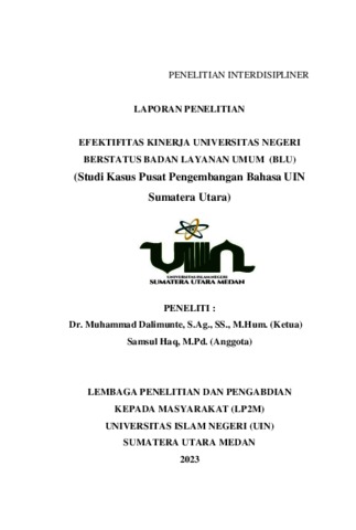 Dalimunte, Muhammad (2023) Efektivitas Kinerja Universitas Negeri Berstatus Badan Layanan Umum (BLU) (Studi Kasus Pusat Pengembangan Bahasa UIN Sumatera Utara). Lembaga Penelitian dan Pengabdian Kepada Masyarakat (LP2M) Universitas Islam Negeri Sumatera Utara Medan.