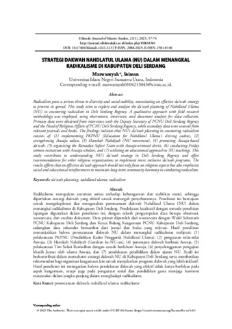 Marwansyah, Marwansyah and Soiman, Soiman Strategi Dakwah Nahdlatul Ulama (NU) Dalam Menangkal Radikalisme Di Kabupaten Deli Serdang. Hikmah: Journal of Islamic Studies. ISSN 2581-0146