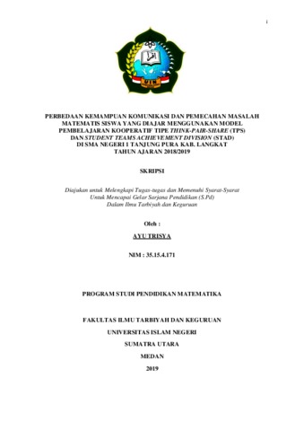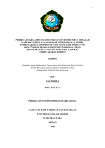 Penelitian ini bertujuan untuk mengetahui perbedaan kemampuan komunikasi dan pemecahan masalah matematis siswa yang diajar menggunakan model pembelajaran kooperatif tipe Think-Pair-Share (TPS) dan Student Teams Achievement Division (STAD) Di SMA Negeri 1 Tanjung Pura Kab. Langkat Penelitian ini adalah penelitian kuantitatif dengan jenis penelitian quasi experiment. Populasinya adalah seluruh siswa kelas XI SMA Negeri 1 Tanjung Pura Kab. Langkat yang terdiri atas 5 kelas yang berjumlah 146 siswa, sedangkan sampelnya 30 siswa untuk kelas eksperimen 1 dan 30 siswa untuk kelas eksperimen 2. Teknik pengambilan sampel yang digunakan adalah cluster random sampling. Adapun instrumen yang digunakan adalah tes yaitu tes kemampuan komunikasi matematis dan tes kemampuan pemecahan masalah matematis, masing-masing terdiri dari 5 soal yang berbentuk uraian soal. Berdasarkan analisis data dengan menggunakan analisis deskriftif pada hipotesis pertama diperoleh ̅ 71,633, St.Dev = 10,604 di kelas eksperimen 1 dan ̅ 52,767, St.Dev = 10,718 dikelas eksperimen 2, pada hipotesis kedua diperoleh ̅ = 72,333, St.Dev = 10,293 dikelas eksperimen 1 dan ̅ = 63,500, St.Dev = 11,209 dikelas eksperimen 2, dan hipotesis ketiga diperoleh ̅ = 72,483, St.Dev = 10,396 dikelas eksperimen 1 dan ̅ = 58,133, St.Dev = 12,145 dikelas eksperimen. Hasil analisis statistik inferensial dengan uji-t dan taraf signifikan =0,05 untuk hipotesis pertama diperoleh nilai thitung 6,854 ttabel 2,002 berarti thitung>ttabel maka Ha diterima. Hipotesis kedua diperoleh nilai thitung 3,539 ttabel 2,002 berarti thitung>ttabel maka Ha diterima. Hipotesis ketiga diperoleh nilai thitung6,953 ttabel1,980 berarti thitung>ttabel maka Ha diterima. Hasil temuan ini menunjukkan bahwa: Terdapat perbedaan kemampuan komunikasi dan pemecahan masalah matematis siswa yang diajar menggunakan model pembelajaran kooperatif tipe Think-Pair-Share (TPS) dengan siswa yang diajar menggunakan model pembelajaran kooperatif tipe Student Teams Achievement Division (STAD) Di SMA Negeri 1 Tanjung Pura Kab. Langkat Tahun Ajaran 2018/2019