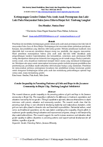 Monika, Dea and Dora, Nuriza Ketimpangan Gender Dalam Pola Asuh Anak Perempuan dan Laki-Laki Pada Masyarakat Suku Jawa Dikota Binjai Kel. Timbang Langkat. Edu Society: Jurnal Pendidikan, Ilmu Sosial, dan Pengabdian Kepada Masyarakat.