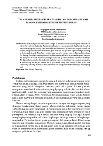 Nazwa, Shopiyyah and Dora, Nuriza Transformasi Peran Perempuan Dalam Dinamika Rumah Tangga Patriarki: Perspektif Pendidikan. RAUDHAH Proud To Be Professionals Jurnal Tarbiyah Islamiyah.